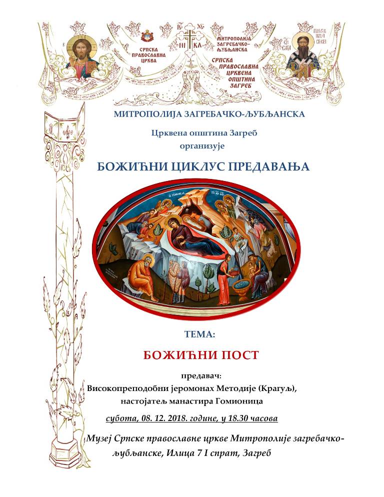 Drugo predavanje u ovogodišnjem božićnom ciklusu predavanja u Zagrebu koje organizuje Crkvena opština zagrebačka održaće visokoprepodobni jeromonah Metodije (Kragulj), nastojatelj manastira Gomionica u Eparhiji banjalučkoj.