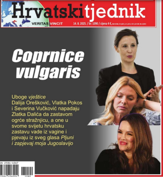 Da je Vukman po svim kriterijumima logike i jezika u tom intervjuu još jednom anatemisao Oreškovićku, pokazuje poslednja naslovnica „Hrvatskog tjednika“ (14.8.). Na njoj su predstavljene tri “corpnice vulgaris“ Dalija Orešković, Vlatka Pokos i Severina kao „veštice običnog“ ili „domaćeg tipa“ koje su kritikovale Tompsona i Dalića.