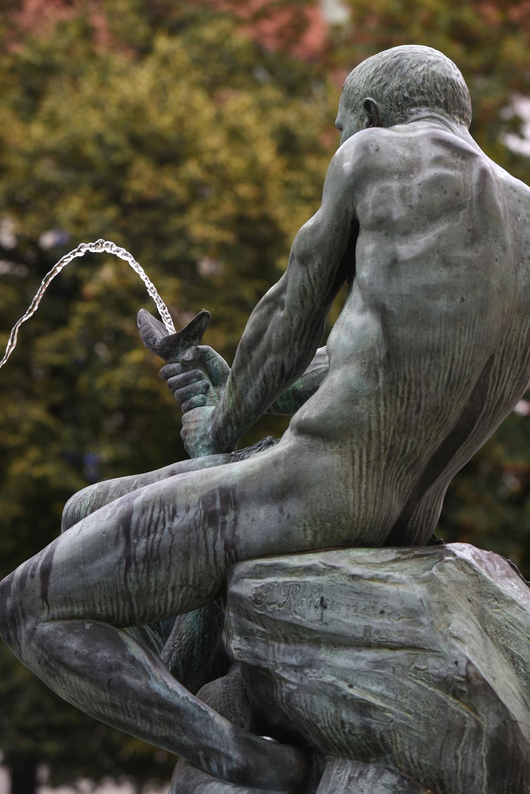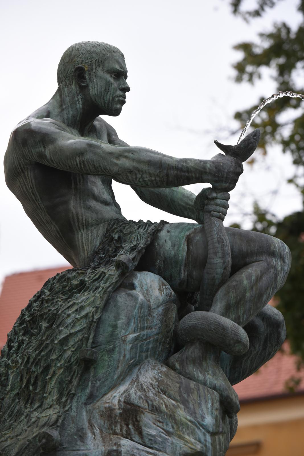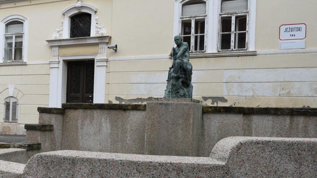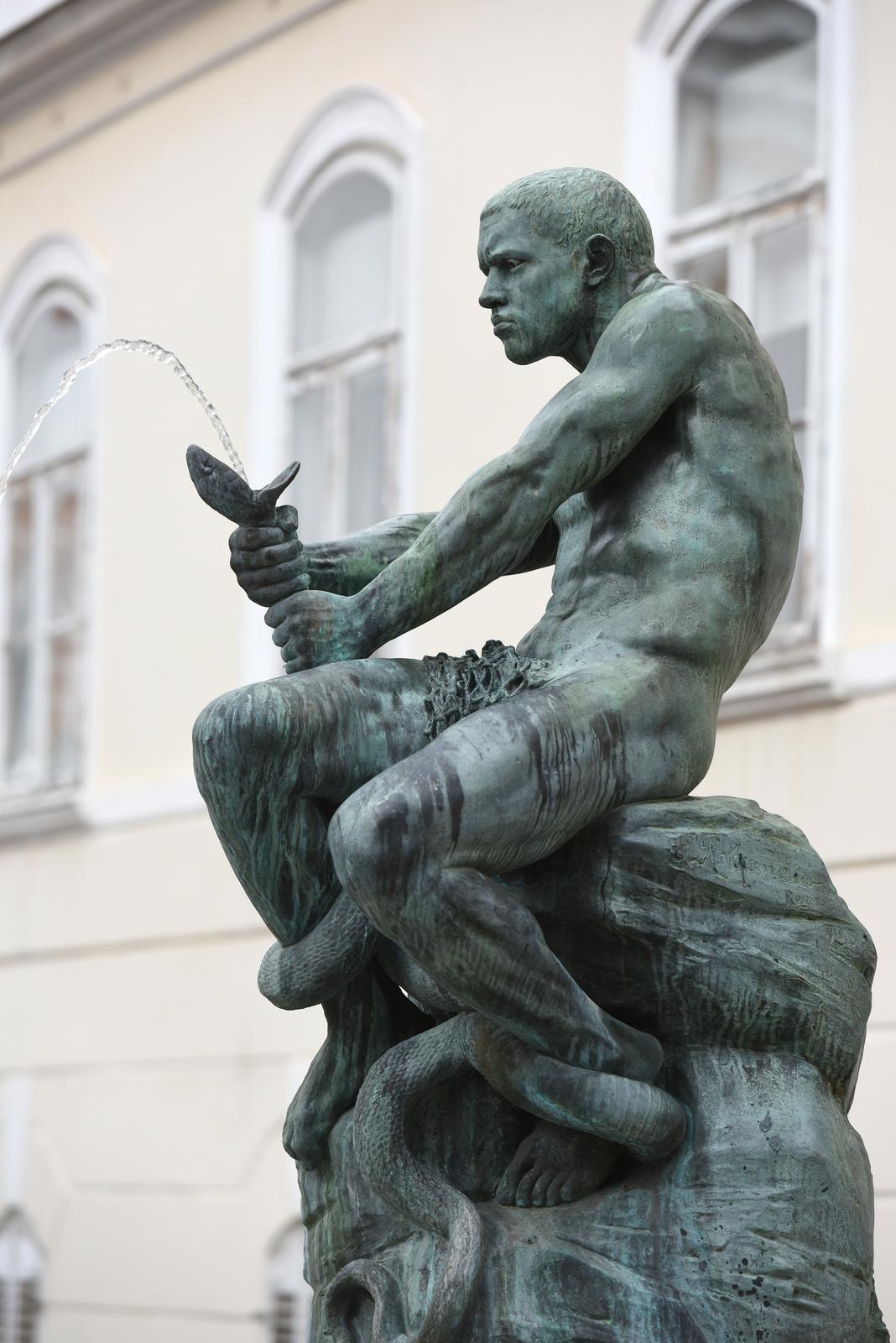 Kad smo kretali Tomićevom ulicom na Uspinjaču, da bismo na Gornjem gradu došli do još jedne od najvažnijih točaka naših zagrebačkih mladosti osamdesetih godina, u katakombe čuvenog kluba u Habdelićevoj ulici, trebalo je preći preko Jezuitskog trga. Tu bi nas na kamenom postolju dočekala dramatska skulptura gole muške figure u bronci, što sjedi na stijeni i bori se s golemom zmijom kojoj iz razjapljenih usta teče mlaz vode koja se ulijeva u mali bazen čineći tako vodoskok. Borba je djelovala zastrašujuće, naročito u baroknom marijaterezijanskom okruženju starih zgrada i kuća Griča koje su skulpturu okruživale.
